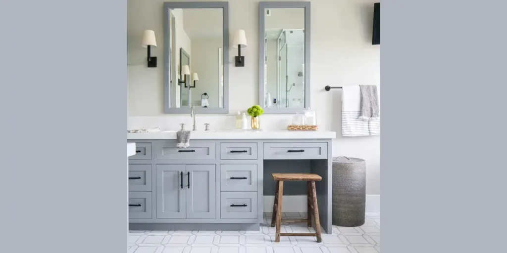 Light neutrals, soft grays, or warm beige tones help brighten the space and make it feel cleaner. These shades also work well with most fixtures and tiles.