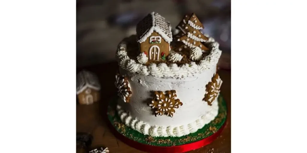 Bake a simple cake and place a small gingerbread house on top as the centerpiece. Surround it with piped snow, candy canes or mini gingerbread men. It gives your cake a cozy, festive village vibe.