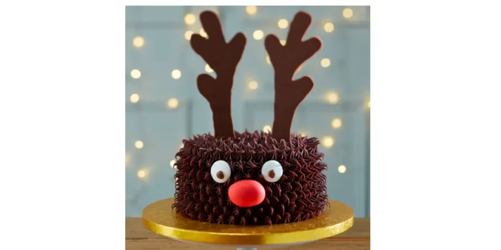 Give your cake a cute character by decorating it as a reindeer. Use brown frosting for the base, pipe big eyes, and add pretzel antlers or fondant antlers for structure. A bright red candy nose completes the Rudolph-inspired look.