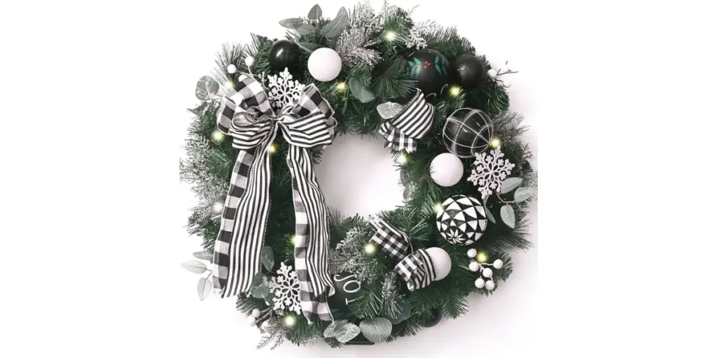This year, classic evergreen wreaths with berries, frosted white or silver wreaths, rustic wood and dried element designs, and oversized bows are all trending. Each style offers a unique vibe, from traditional charm to modern sophistication.