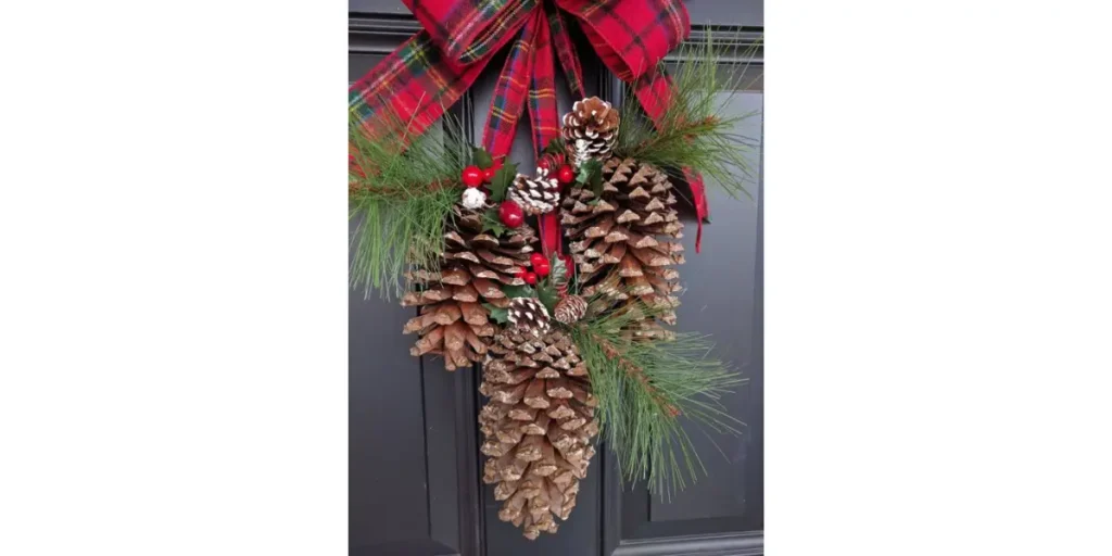 Bringing natural elements to your door adds warmth and charm. Pinecones, dried orange slices, wooden accents, and burlap ribbons give a cozy, rustic vibe.