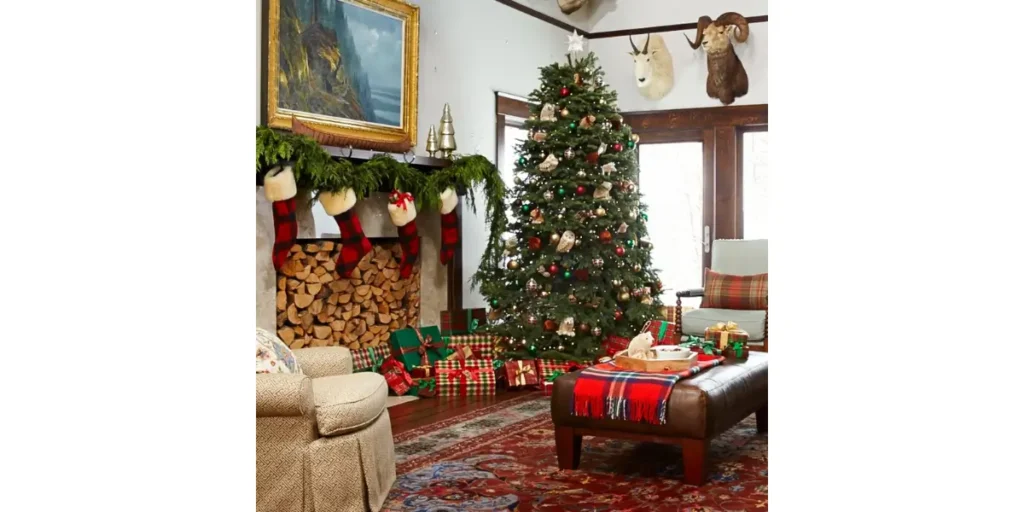 This style blends classic elegance with cozy charm using deep greens, rich reds, tartan patterns, and natural wood accents.