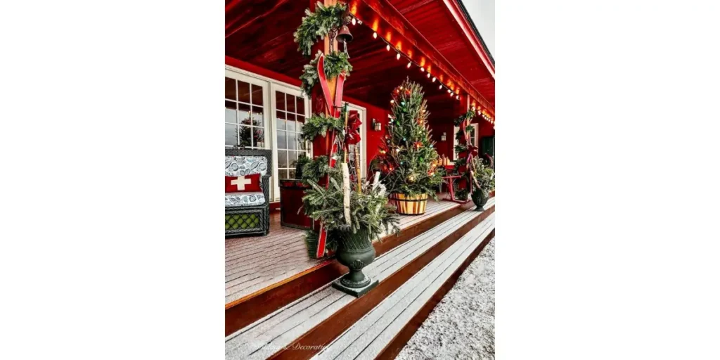 Wooden ornaments, pinecones, burlap garlands, and solar-powered lights create a warm and inviting holiday aesthetic.