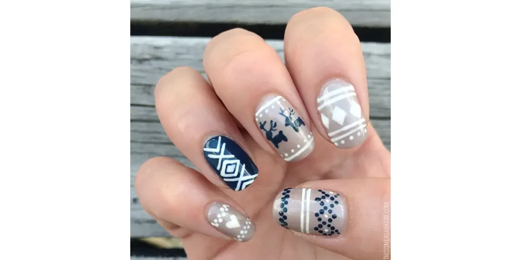 I personally love how this design adds that cozy, “holiday sweater” vibe while still looking chic and put-together. You can create the pattern with thin striping tape or nail art brushes for a neat, clean look.