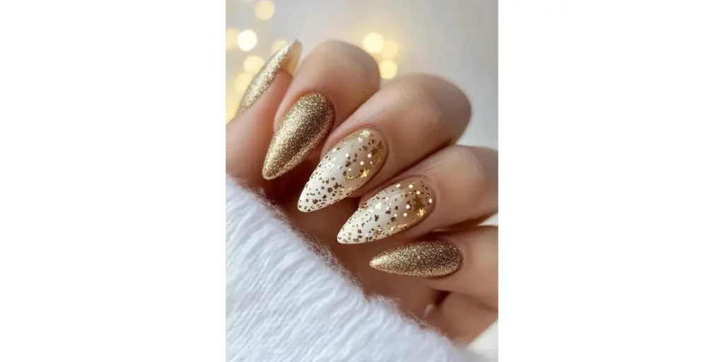 Nothing says luxury like a touch of gold. The Golden Ornament Nails trend brings that sparkle in a sophisticated way, using metallic gold polish, foil flakes, or tiny ornament-like gems.