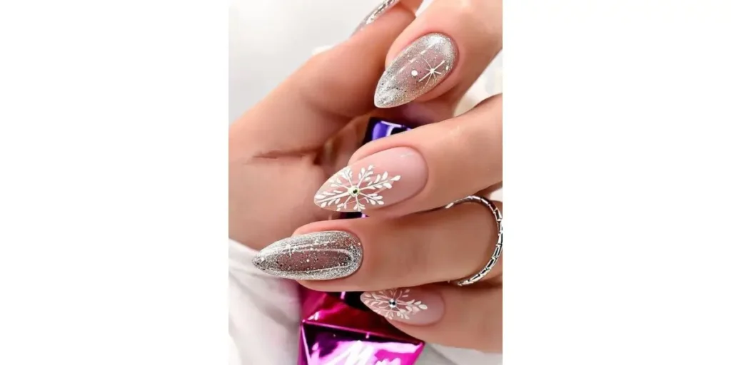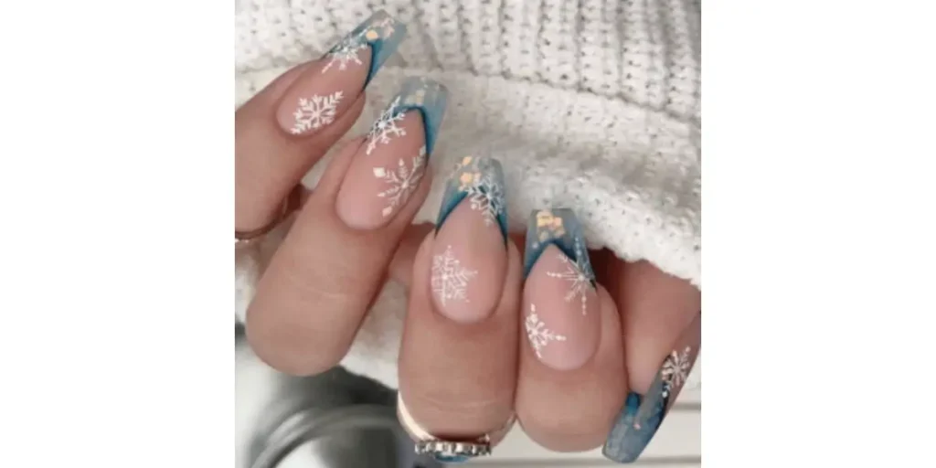 If you’re someone who adores the soft, wintry aesthetic of the holidays, frosted snowflake nails are your go-to design for 2025. Think of a cool, icy-blue or pearl-white base topped with delicate white snowflakes, rhinestones, or subtle glitter.