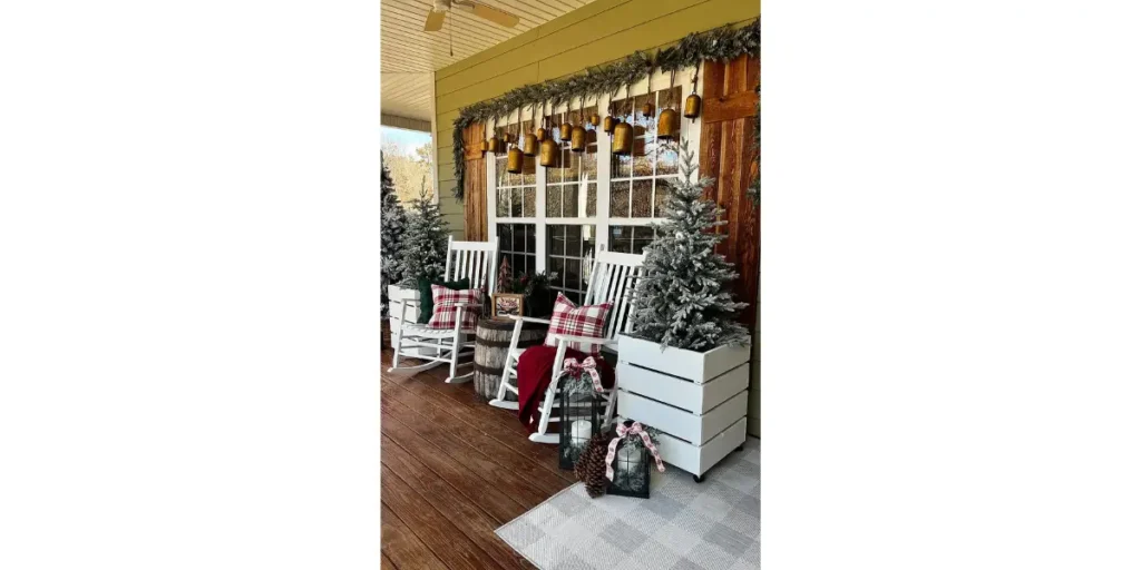 Turn your porch into a warm retreat where guests can relax and feel the holiday spirit. Add a small bench or chair draped with plaid blankets and festive pillows to create that cozy, “Christmas cabin” vibe.