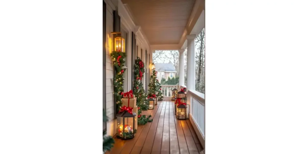 For small porches, focus on vertical décor like hanging swags, mini trees on steps, or decorative lanterns. This draws the eye upward and creates a layered, festive effect without overcrowding your space.