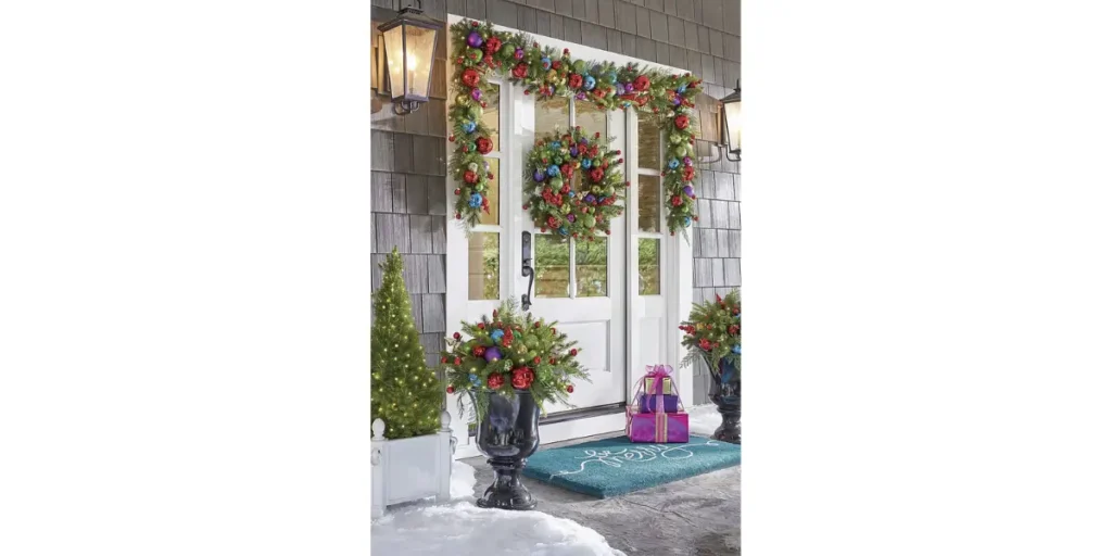 This bold palette catches the eye and adds a sophisticated holiday vibe. It works well on both small and large porches. Teal and gold make your display unique and memorable this 2025 season.