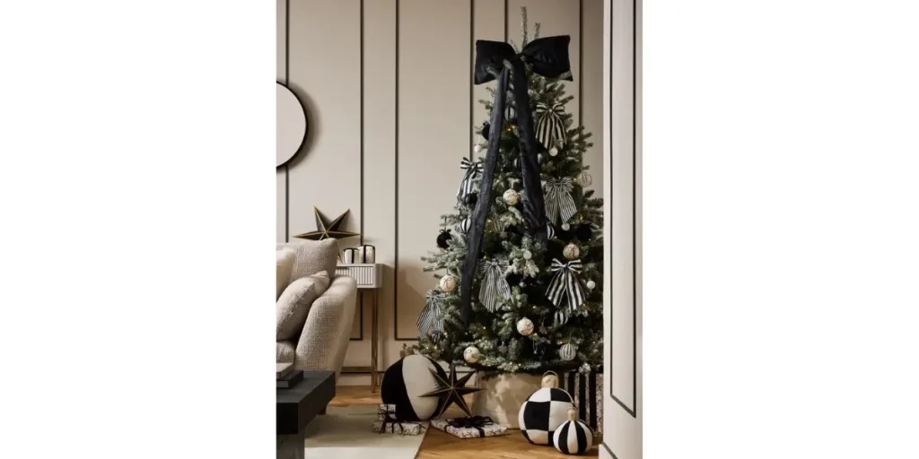 Oversized ornaments, cascading ribbons, and a carefully chosen color palette create a striking focal point.