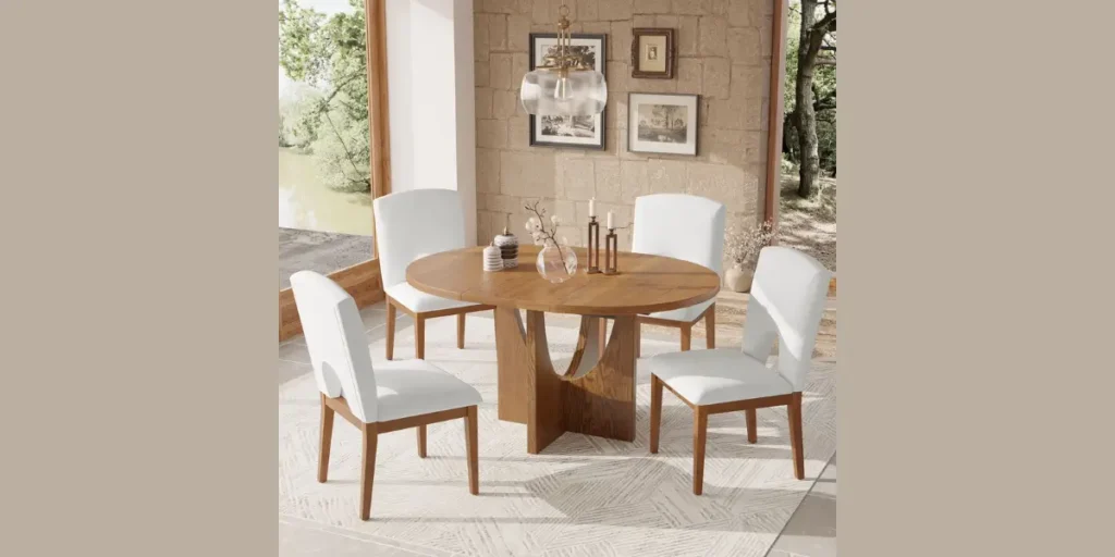 I keep enough space around the table so chairs move easily. The circular shape encourages conversation and flexibility.