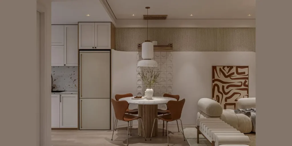 Open-concept layouts connect the dining area with the kitchen or living room. Instead of walls, furniture and lighting define the dining zone.