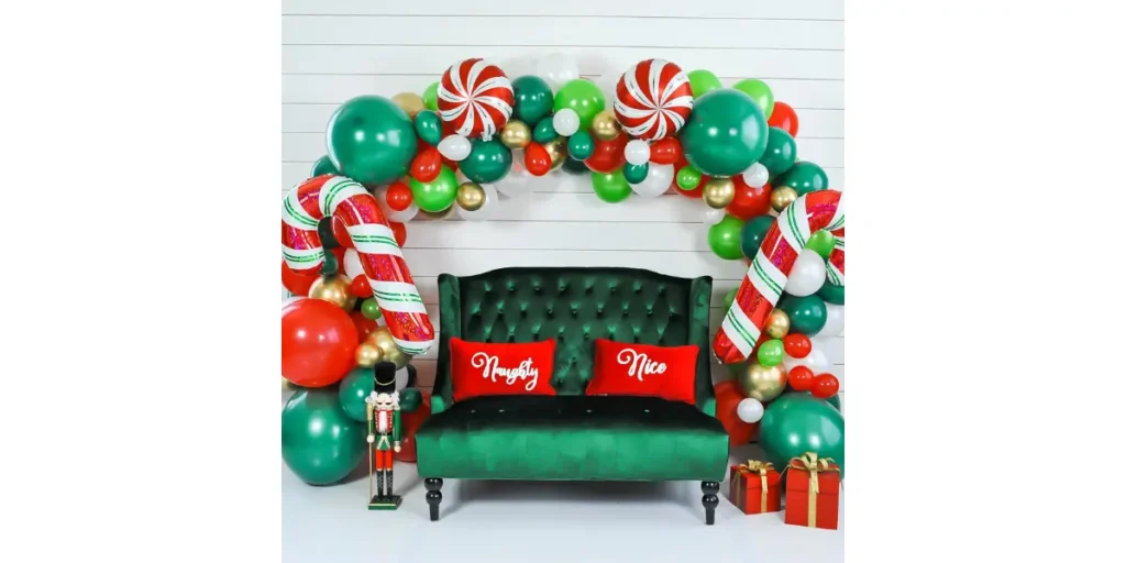 A balloon garland is one of the most cheerful ways to create a holiday backdrop, and it always looks great in photos. I enjoy using a mix of red, white, green and metallic gold balloons to build a playful arch or frame.