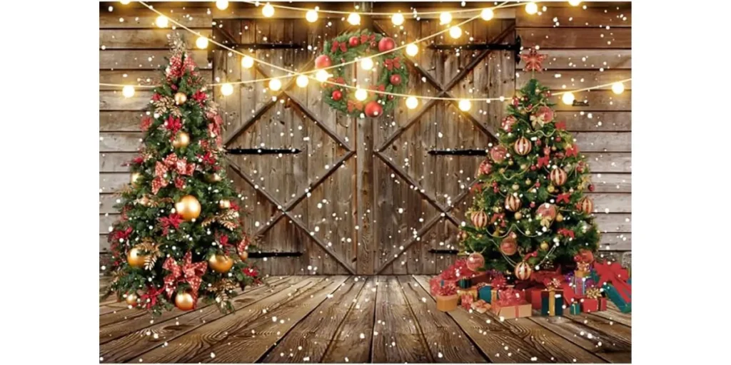If you want a backdrop that feels warm and inviting, a rustic wood setup is a perfect fit. Faux wood panels or a wooden wall give the scene a natural base, while greenery garlands and pinecones add the Christmas touch.
