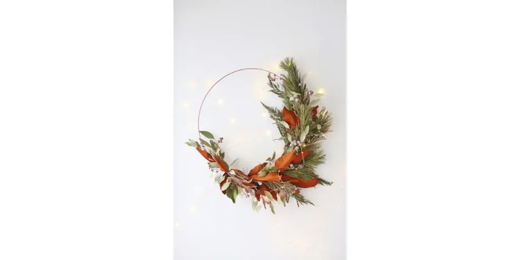 A minimalist hoop wreath is one of the simplest yet most stylish options for modern holiday decor. I enjoy using a thin metal ring because it creates a clean base that feels light and elegant.