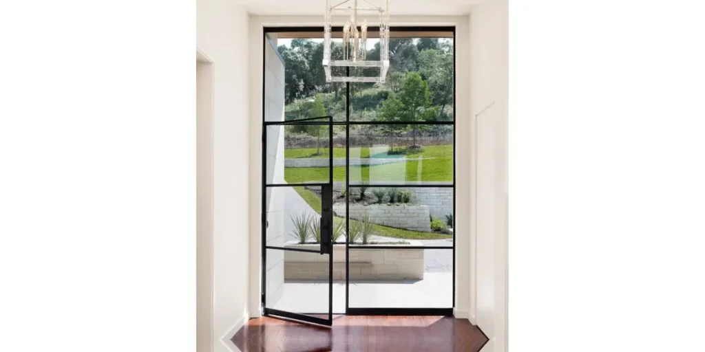Black frame glass doors add structure and contrast to interiors. The dark frame outlines the glass clearly, creating a strong architectural statement without blocking light.