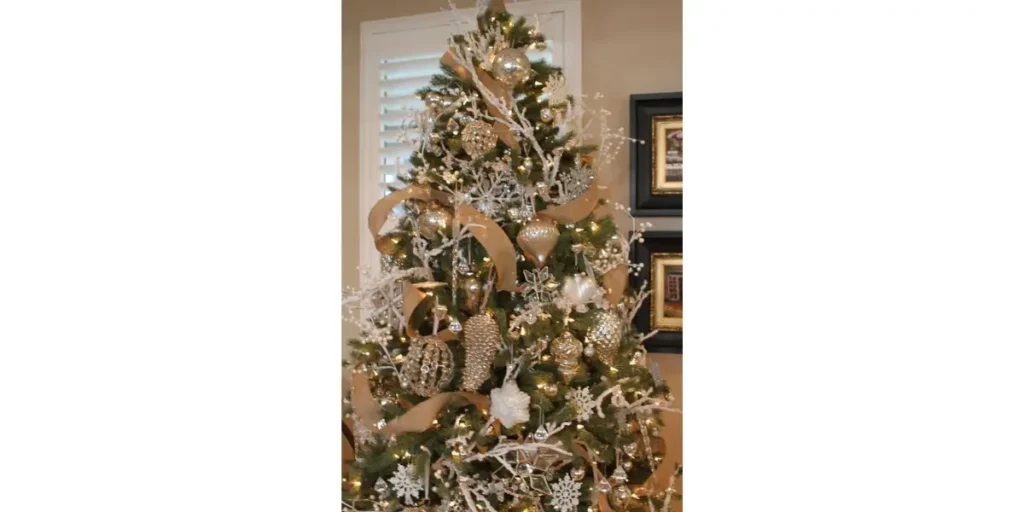 These accents combine the charm of nature with the elegance of metallic shine, creating a balanced and inviting look. Gold-painted branches or pinecones provide texture and dimension, enhancing the overall tree aesthetic.