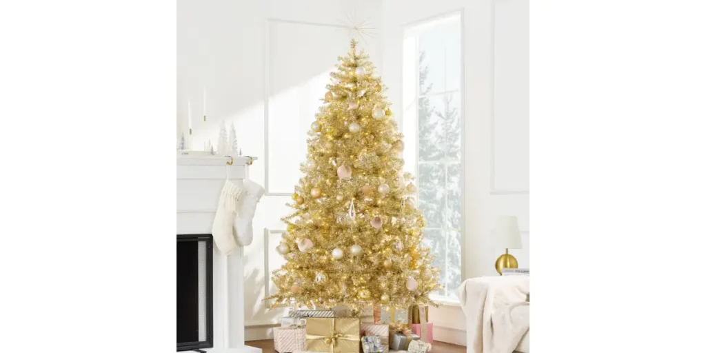 A champagne gold tinsel tree creates a soft metallic shimmer that instantly brightens any room. The reflective tinsel catches light beautifully, making the tree glow without needing excessive decorations.