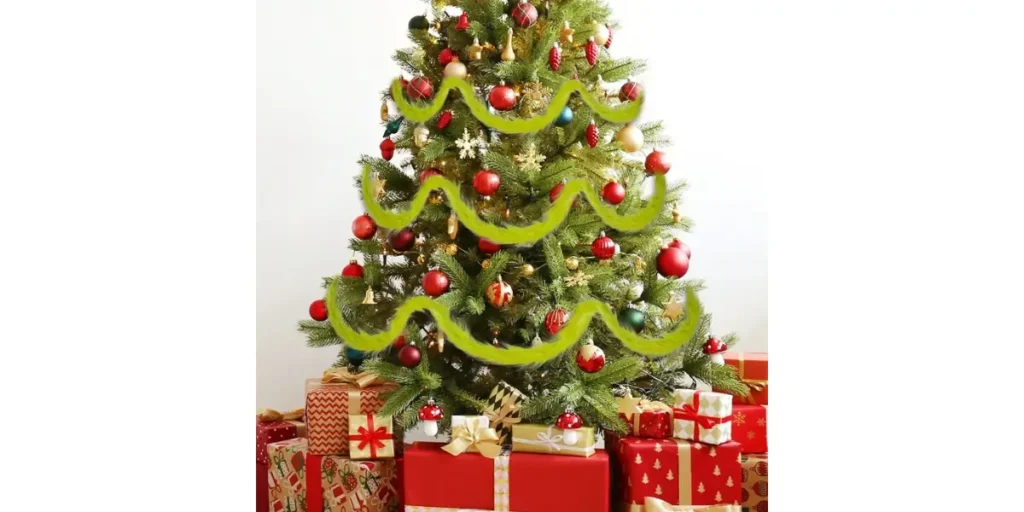 Bright green fuzzy garlands are a simple but highly effective way to mimic the Grinch’s signature fur. Wrapping this type of garland around the tree adds texture and a playful touch, making your decorations feel more three-dimensional.