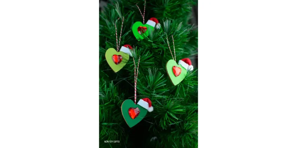 It pairs beautifully with green garlands and playful Grinch elements. Using shiny or glittery finishes enhances the festive look and makes these heart ornaments pop under tree lights.