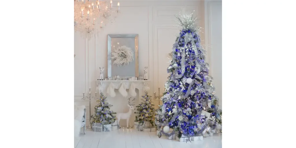 Think flocked Christmas trees, snowflake ornaments, and crystal candle holders that reflect soft LED lights. Adding a few frosted garlands or silver accents instantly elevates the décor.