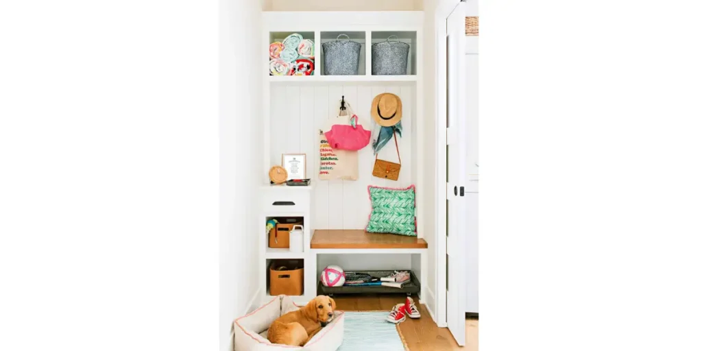 A mud room should store everyday essentials like shoes, coats, bags, and seasonal accessories. I avoid storing items that are rarely used. Keeping only daily necessities helps prevent overcrowding. This keeps the space functional and easy to manage.