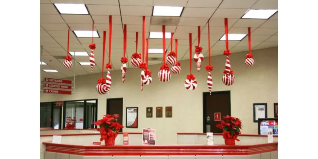 Hanging lightweight ornaments or snowflakes from the ceiling in break rooms, corridors, or common areas instantly adds a festive vibe.