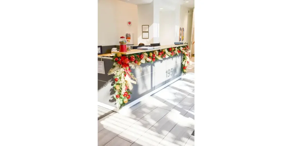 Decorating the reception desk can create a welcoming, festive atmosphere for visitors and employees alike. Adding a small tree, a festive runner, and some subtle lights can make a big difference.