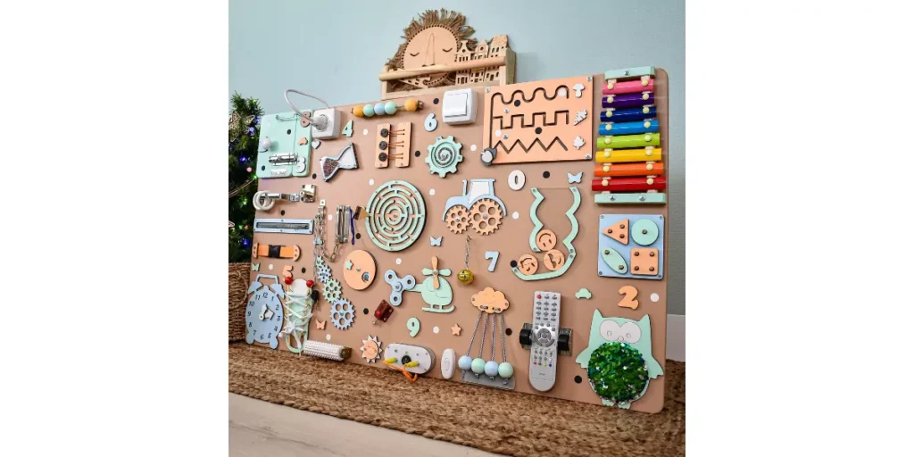 Boards can include chalk areas, puzzles, sensory elements, or simple learning tools. This approach makes the room interactive without adding clutter.