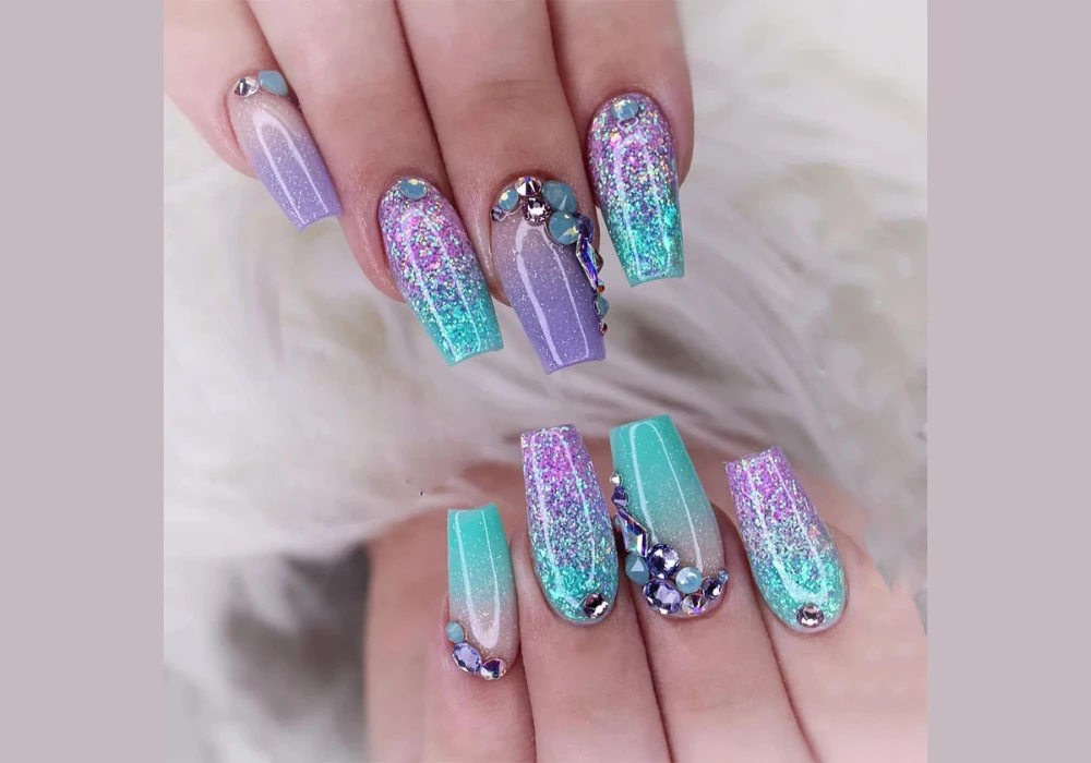 I prefer gold or silver glitter with nude or pastel bases. This creates a balanced and clean look.