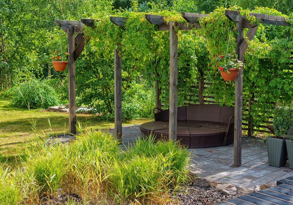 I build them using wood or metal frames. They are strong enough to support heavy vine growth. Plants like grapevine or wisteria work very well. They spread evenly over the top.