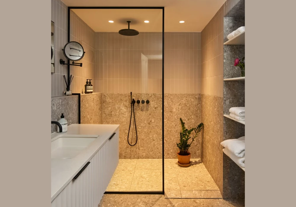 I usually choose neutral or stone-look tiles for a natural appearance. This keeps the design modern and balanced. Simplicity works best.