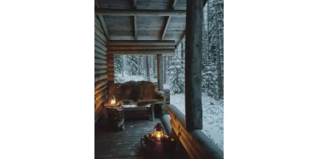 I’ve noticed that even a small porch adds charm when it’s styled simply with wooden railings, benches, or rocking chairs dusted with snow. This setup makes the cabin feel like a true winter retreat rather than just a structure in the cold.