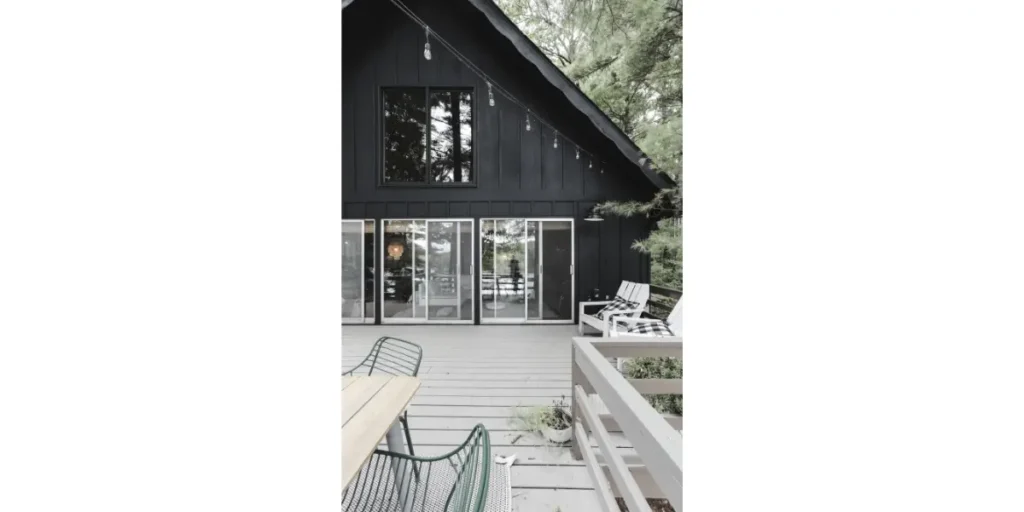 This strong contrast creates a bold, modern look while still feeling grounded in nature. The simplicity of dark finishes also allows the cabin’s shape and structure to take center stage.