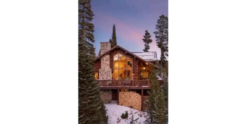 Log walls, timber beams, and natural finishes blend beautifully with snowy surroundings, making the cabin feel like part of the landscape rather than sitting on it.